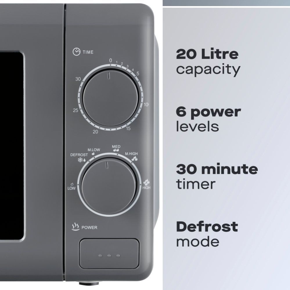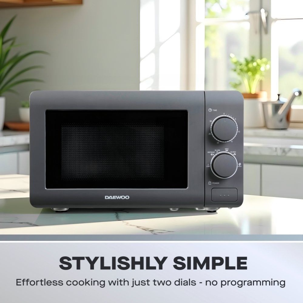 Upgrade your kitchen with the Daewoo 20L Manual Microwave, featuring a sleek matte grey finish that complements any modern kitchen decor. With its powerful 800W output, this microwave delivers reliable performance for all your cooking and reheating needs.