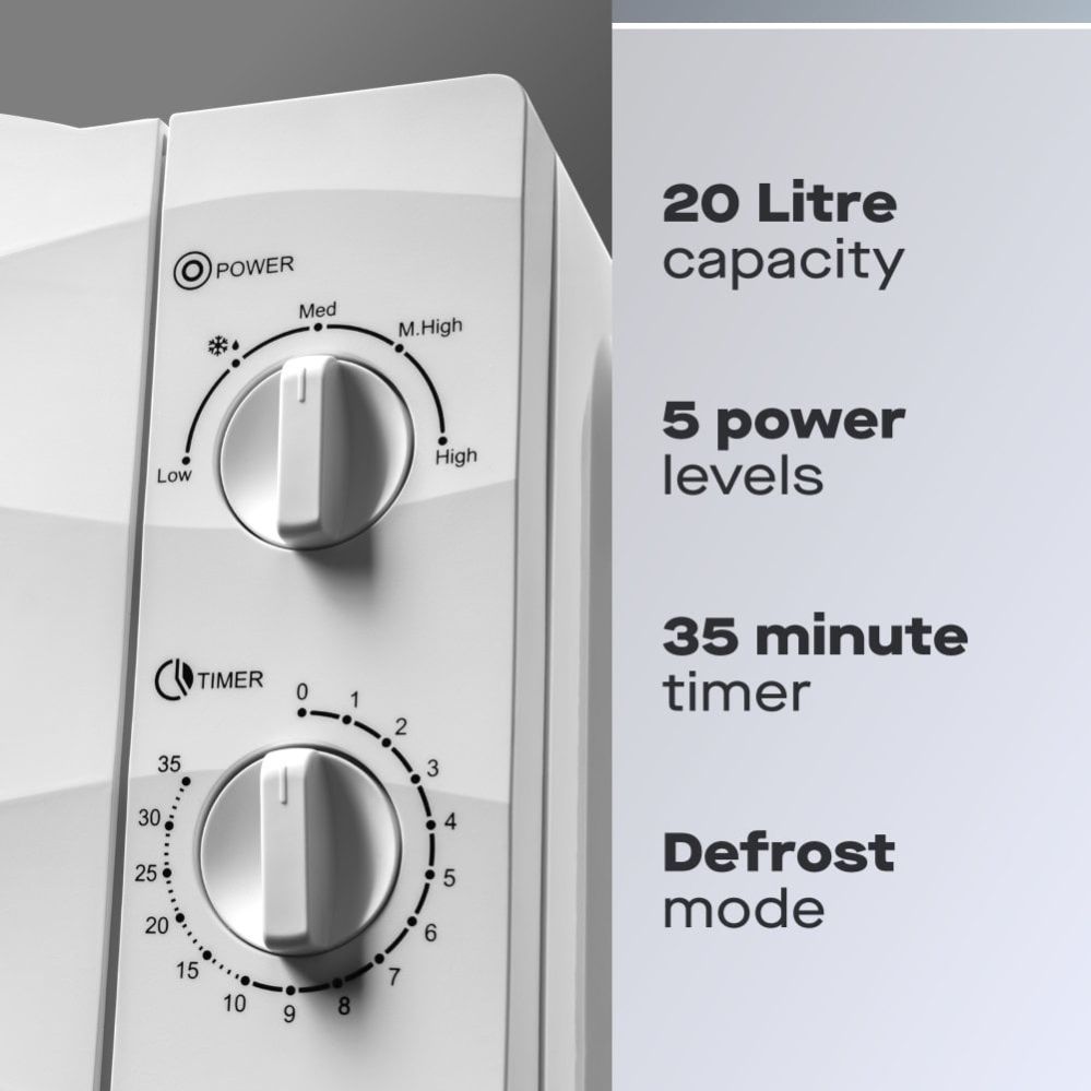 Large 20L capacity | 700W - fast & powerful | 5 power levels including defrost function | Textured 'wave' design | 35 minute timer | 3 year extended warranty (online registration)