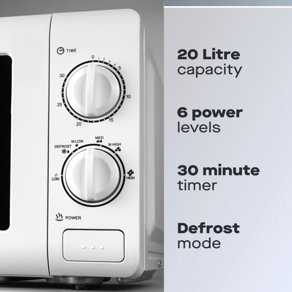 800W power | Large 20L capacity | 6 power settings & defrost function | 30 minute timer | Stainless steel cavity | Removable turntable for easy cleaning | 3 year extended warranty (online registration).