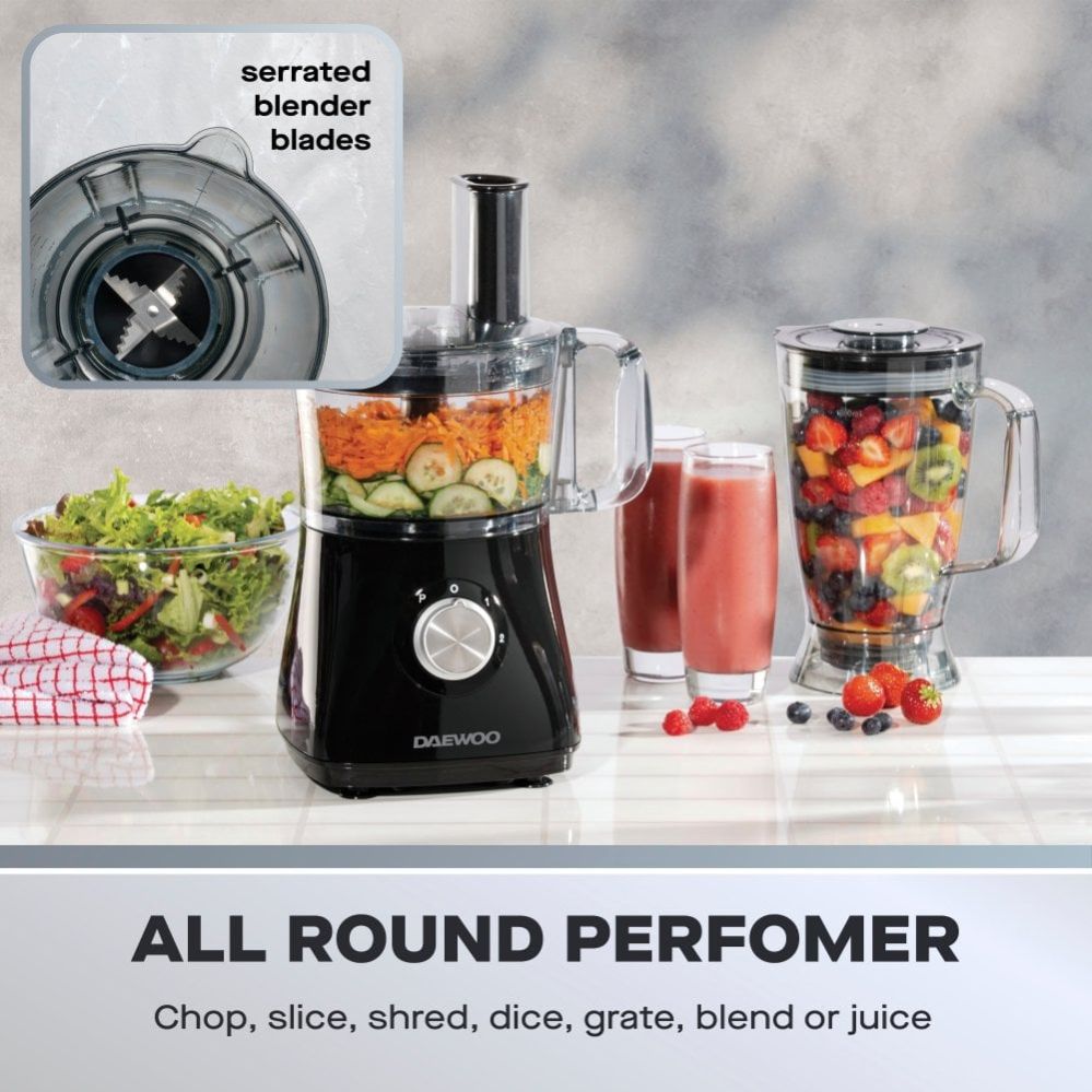 2L food processor & 1.8L blender - Includes both jugs for total prep flexibility | 750W motor - Powerful performance for chopping, blending, slicing and more | 2 speed settings and pulse - Control your texture from coarse to smooth | Stainless steel blades - Durable, precise cutting for all types of ingredients | Large capacity - Ideal for family meals, batch prep and big portions | Multi-function use - Blend smoothies, make soups, grate cheese or chop veg | Easy-clean detachable parts - Designed for quick rinsing and less mess | Non-slip feet - Keeps everything stable while in use | 3 year extended warranty (online registration)