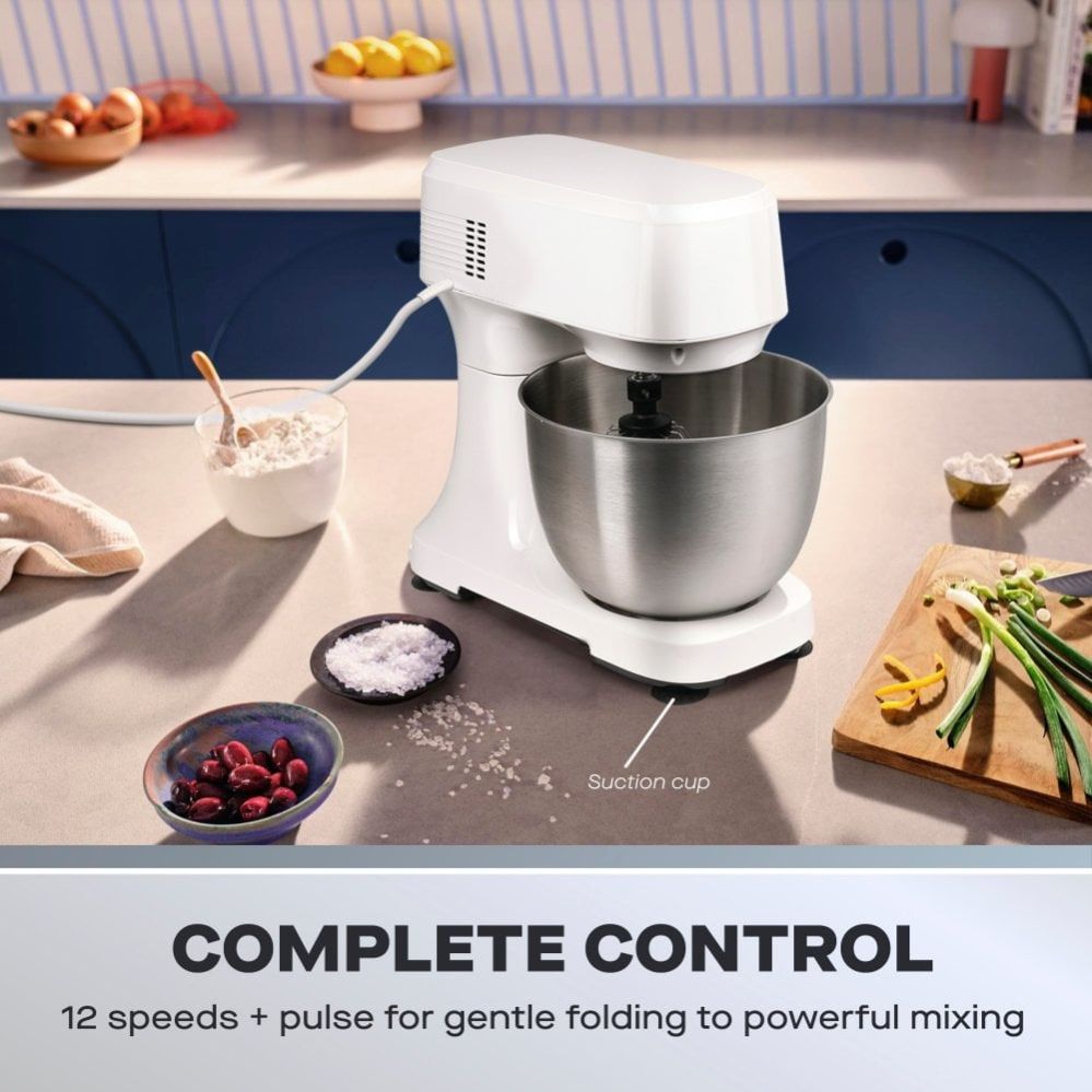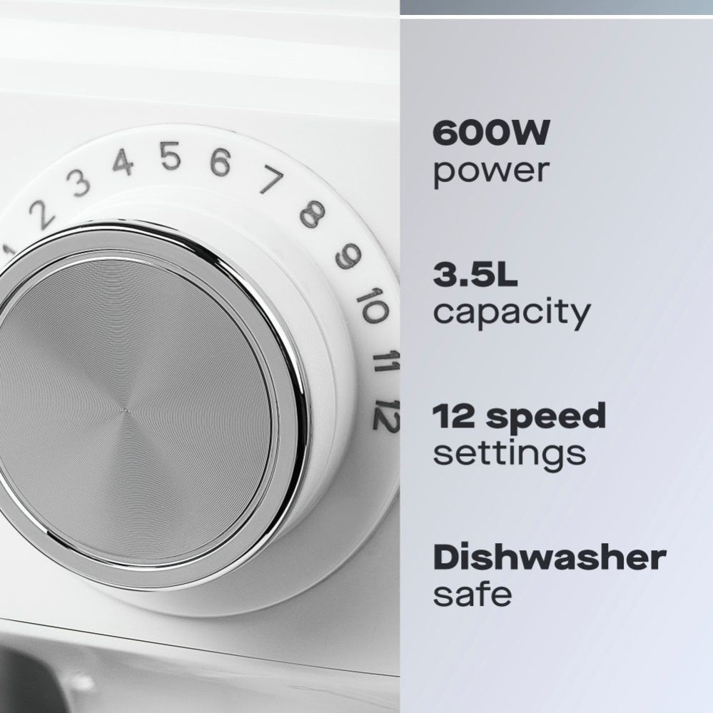 12 speed dial & pulse mode | Includes 3.5L bowl, beater, whisk & dough hook | Splashguard lid with chute for easy pouring | Pop-up head lift – swap tools easily | Easy clean dishwasher safe parts | Non-slip suction feet | 600W power