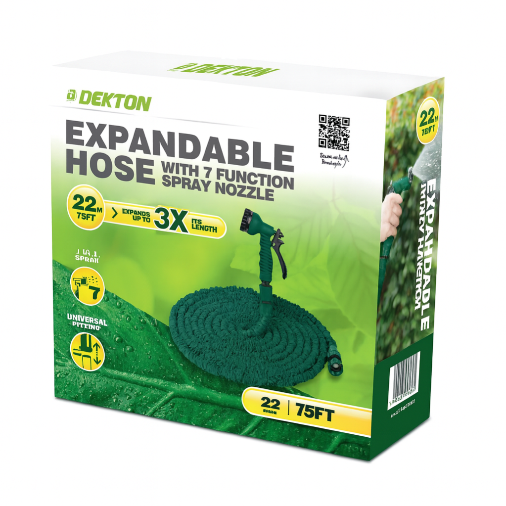 The DEKTON Expandable Garden Hose – 22.5 m (75 ft) is engineered for convenience and performance. When pressurized, it expands from a compact size to full length, and contracts back for tidy storage. Its inner latex core is wrapped in a sturdy, abrasion-resistant fabric that resists kinks, tangles, and leaks.