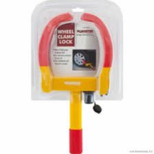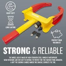 Durable wheel clamp lock designed to deter theft and unauthorized movement. Features a bright yellow-and-red finish, adjustable arms, and secure locking system—ideal for cars, trailers, vans, and caravans.